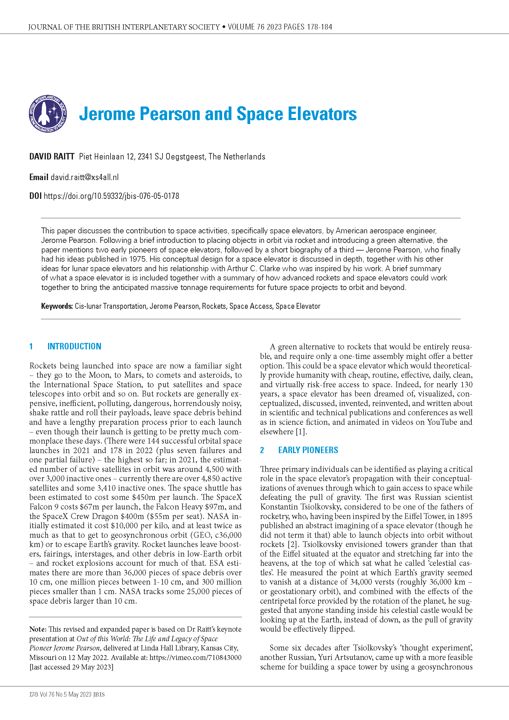 This paper discusses the contribution to space activities, specifically space elevators, by American aerospace engineer, Jerome Pearson. Following a brief introduction to placing objects in orbit via rocket and introducing a green alternative, the paper mentions two early pioneers of space elevators, followed by a short biography of a third — Jerome Pearson, who finally had his ideas published in 1975. His conceptual design for a space elevator is discussed in depth, together with his other ideas for lunar space elevators and his relationship with Arthur C. Clarke who was inspired by his work. A brief summary of what a space elevator is is included together with a summary of how advanced rockets and space elevators could work together to bring the anticipated massive tonnage requirements for future space projects to orbit and beyond.