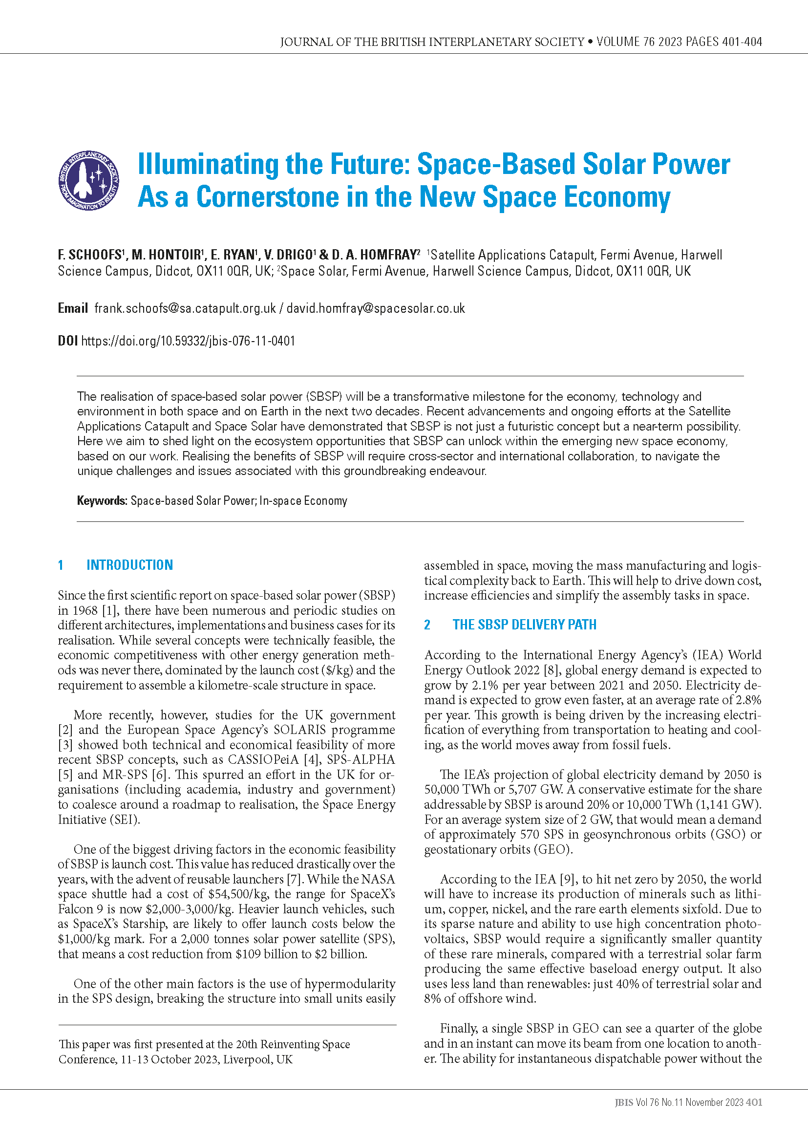 F. Schoofs, M. Hontoir, E. Ryan, V. Drigo & D. A. Homfray (2023), JBIS, 76, pp. 401-404
