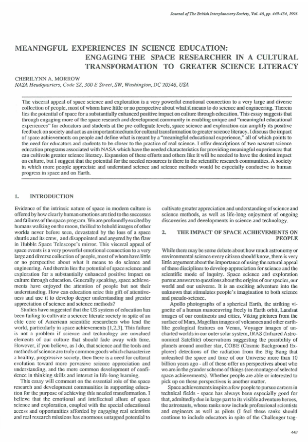 Evidence of the intrinsic nature of space in modern culture is offered by how clearly human emotions are tied to the successes and failures of the space program. We are profoundly excited by humans walking on tl1e moon, thrilled to behold images of other worlds never before seen, devastated by the loss of a space shuttle and its crew, and disappointed and angered by the flaw in Hubble Space Telescope’s mirror. This visceral appeal of space events is a very powerful emotional connection to a very large and diverse collection of people, most of whom have little or no perspective about what it means to do science and engineering. And therein lies the potential of space science and exploration for a substantially enhanced positive impact on culture through education. Generally speaking, space achievements have enjoyed the attention of people but not their understanding. How can education seize this gift of attentiveness and use it to develop deeper understanding and greater appreciation of science and science methods?