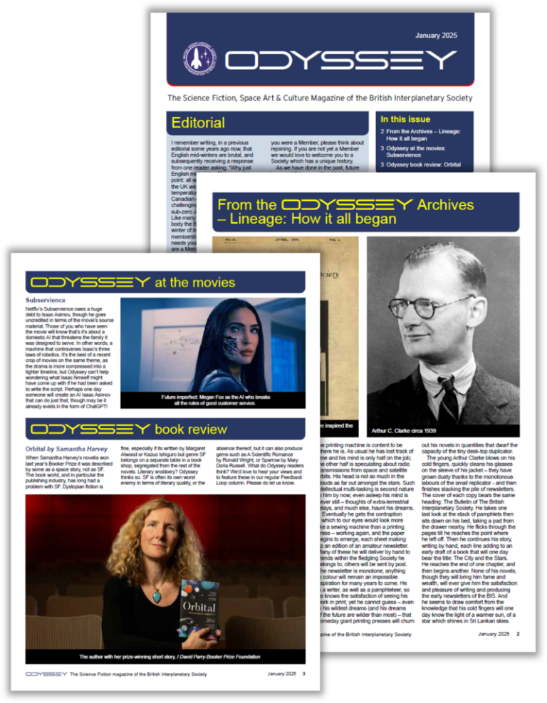Odyssey is the Society’s electronic science fiction, space art and culture magazine, issued bi-monthly FREE to members. The scope of Odyssey is wide ranging and reflects the imaginative side of space from the motto of our Society: ‘From Imagination to Reality.’