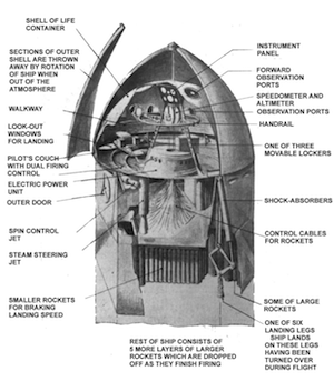 Mercury’s cabin was provided with a heat shield against frictional heating upon re-entry to the atmosphere, retro-rockets and parachutes for braking and descent. Megaroc needed no special heat shield and relied on a reefing parachute ejected by spring flaps and a compressed air charge to provide constant drag irrespective of air-density and velocity of descent. Megaroc’s cabin was suitable for either sea or land impact and was fitted with a crumple skirt to absorb some of the shock and avoid bounce with a quick-release mechanism for the parachute.